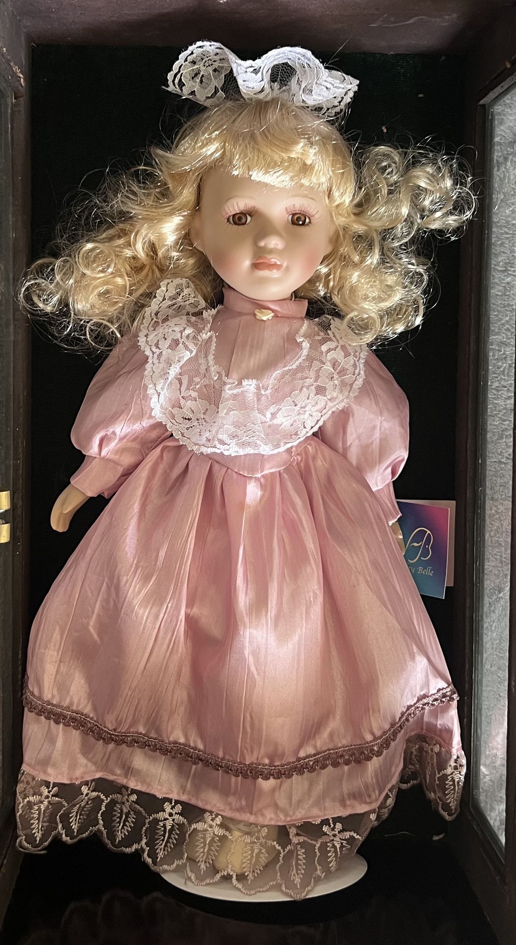 Ashley Belle collection “Carol” Limited Edition. Blonde porcelain doll with lace-trimmed pink dress in the original wooden box. The wood box has gotten a few chips over the years. Item for pickup 🛻