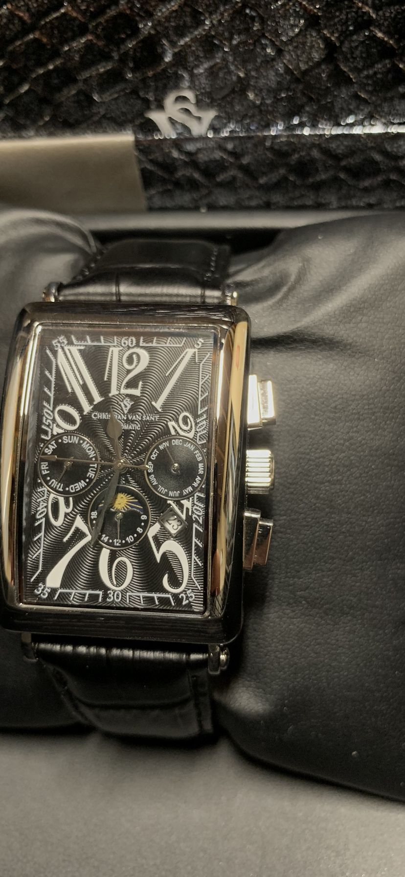 Christian Van Sant Prodigy Automatic Beautiful watch inspired by classic and modern design inspired from art, architecture and old stylish elegance. Original price is $1,995.00 Price is negotiable Product Details — Model #: CV9130 — Gender: Male — In Line Or Closeout: In-line — Movement: Automatic — Case Diameter: 52mm — Case Thickness: 14mm — Case Material: Stainless Steel — Crystal Material: Mineral — Dial Color: Black — Water Resistant: 50M — Bracelet Material: Leather — Bracelet Length: 7.5" — Buckle: Original Tang — Lug Width: 23mm — Documents: Warranty Card — Booklets: None — Box Type: Original — Warranty: Manufacturer's Limited 2 Year