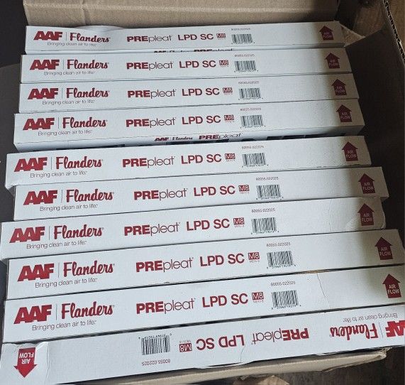 Flanders 20" x25" x 2" Pre-Pleat Furnace Air Filters -. 20 x 25 x 2 in.Pre-Pleat 40 Air Filter. 100% Synthetic. High Dust HoldingCapacity & Low Pressure Drop. Expanded Metal Backing& Diagonal Grid Supports For Maximum Strength. The unit is in perfect condition This is Like New and FullyFunctional. However the product may have been taken out of packaging or theouter packaging may show signs of scuffs only on the box. Slightbend on one side of 3 filters AAF FLANDERS MERV 8 40 LPD STANDARD AIR FILTER 20 X 25 X 2" CASE 10