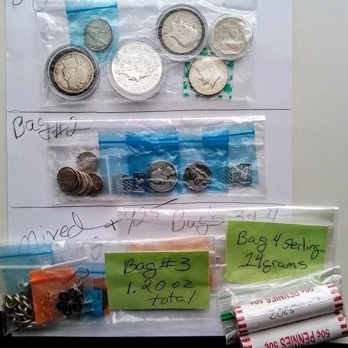 Bag 1 = 1967, 1969 Kennedy Halves.1997 Queen Elizabeth II 50 Pence,1968 Canadian 25 Cents,1907 S Barber Halve, 2021 Queen Elizabeth II Two Pounds 1oz. David Bowie .999. / Bag 2 = 1941 Mercury Dime, 1943, 1945 War Nickels, 1935, 1951 D Washington Quarters, 6 Silver Roosevelt Dimes. / Bag 3 = Mix of Sterling jewelry pieces. Bag 4 = mixed 925 jewelry. Separate single pieces are 999 bracelet, 12k gf ring , 14k earing with back , 333 pendant , 14 gf cameo , 835 pendant . Bonus ( 2 ) Sealed Uncirculated 2025 Bank Rolls from the last production year of the legendary Lincoln Cent. Hot item