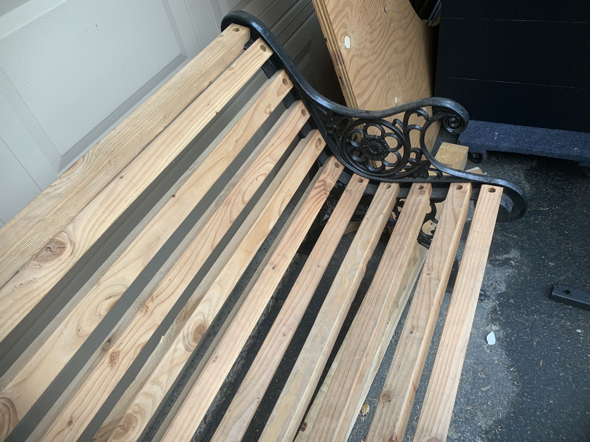 Cast iron and wood bench. This thing is big and heavy. Weighs around 200 lbs. New wood. Delivery as an option