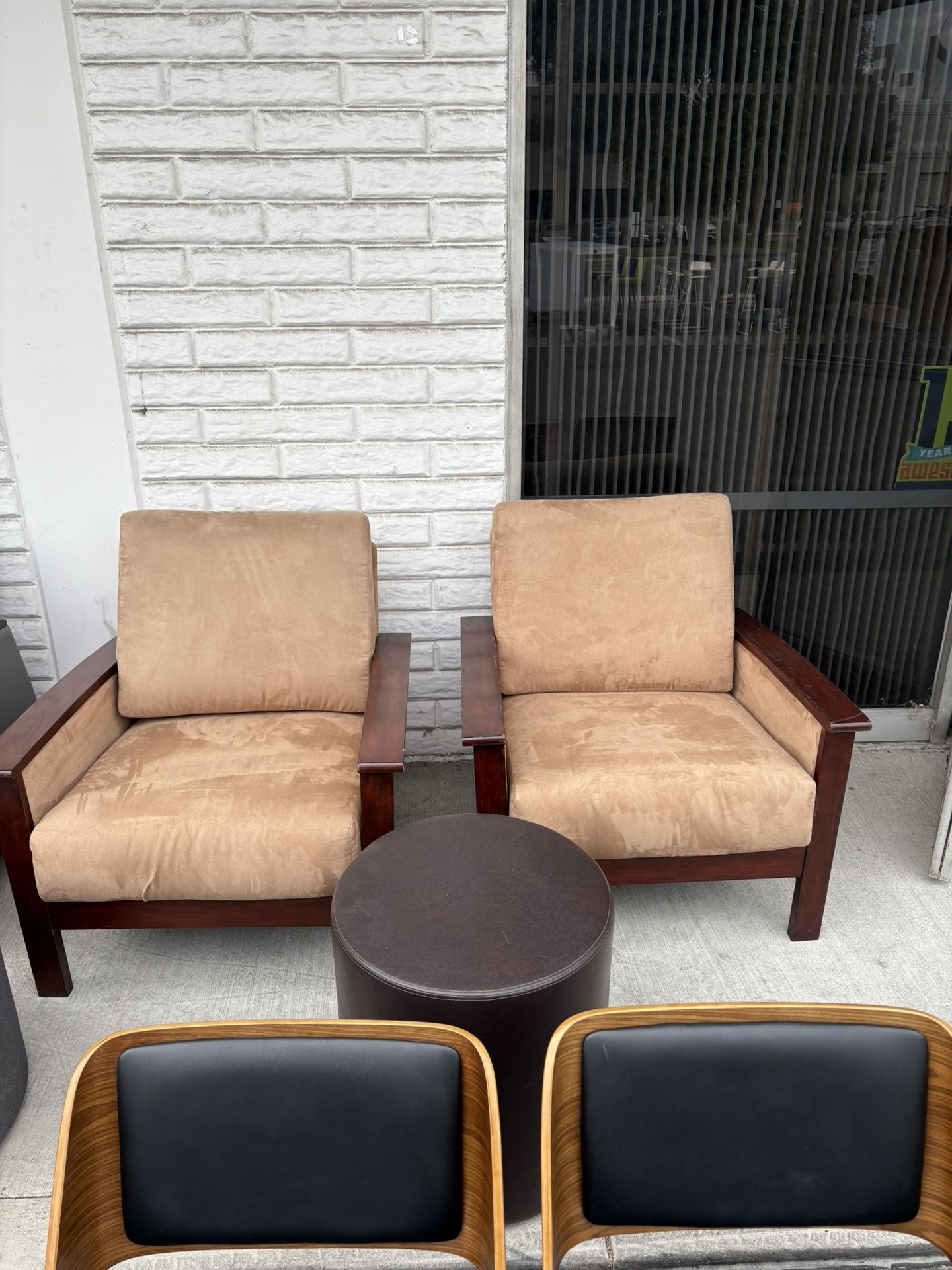 2 Tan felt lounge chairs Minor scratches on wood No Tears 80$ each