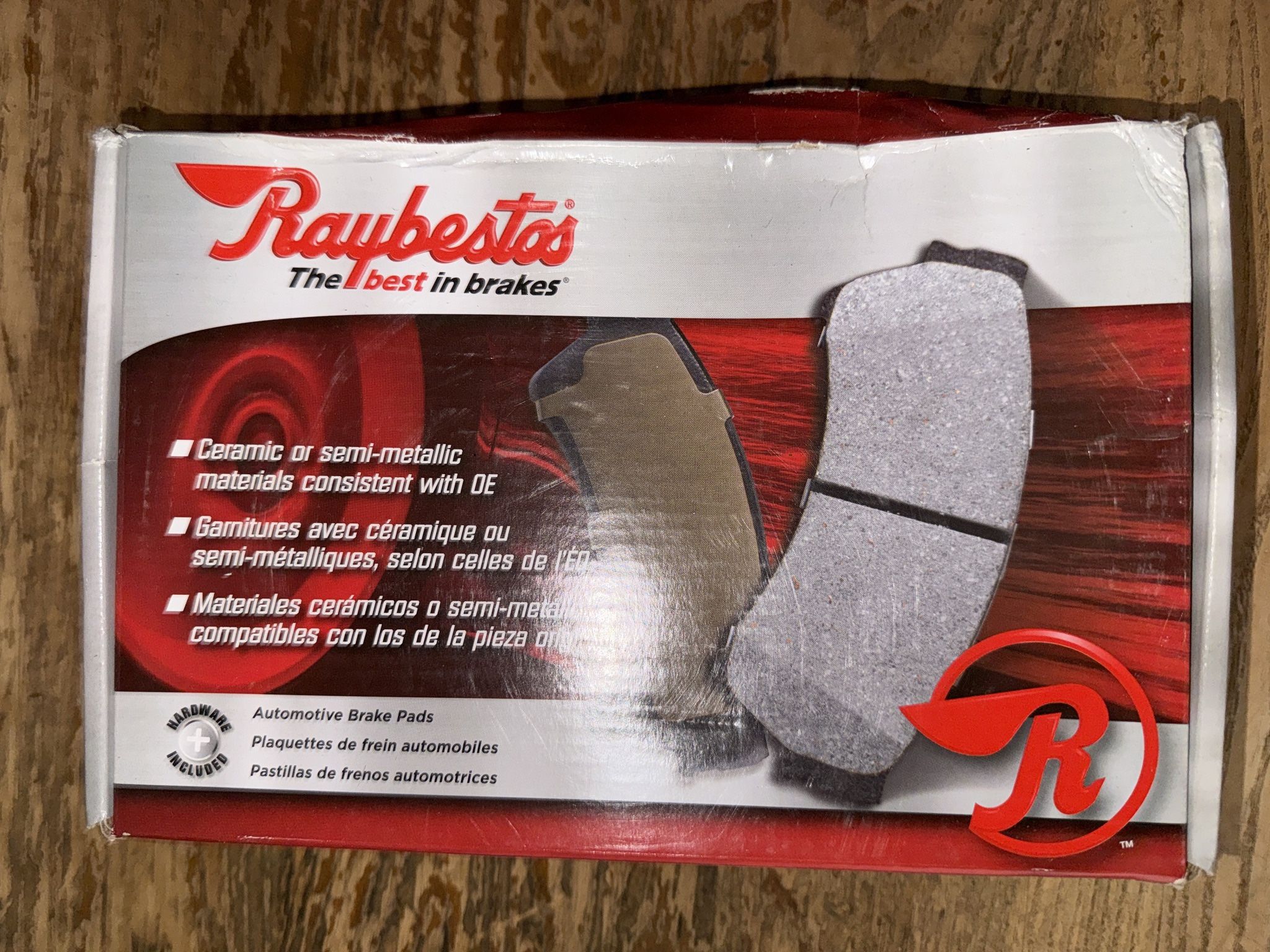 New Raybestos brake pads set. Open box but never installed. Raybestos is a well-known brand for quality brake components. Pads include hardware and are ready for installation. Box shows minor storage wear but parts are new.
