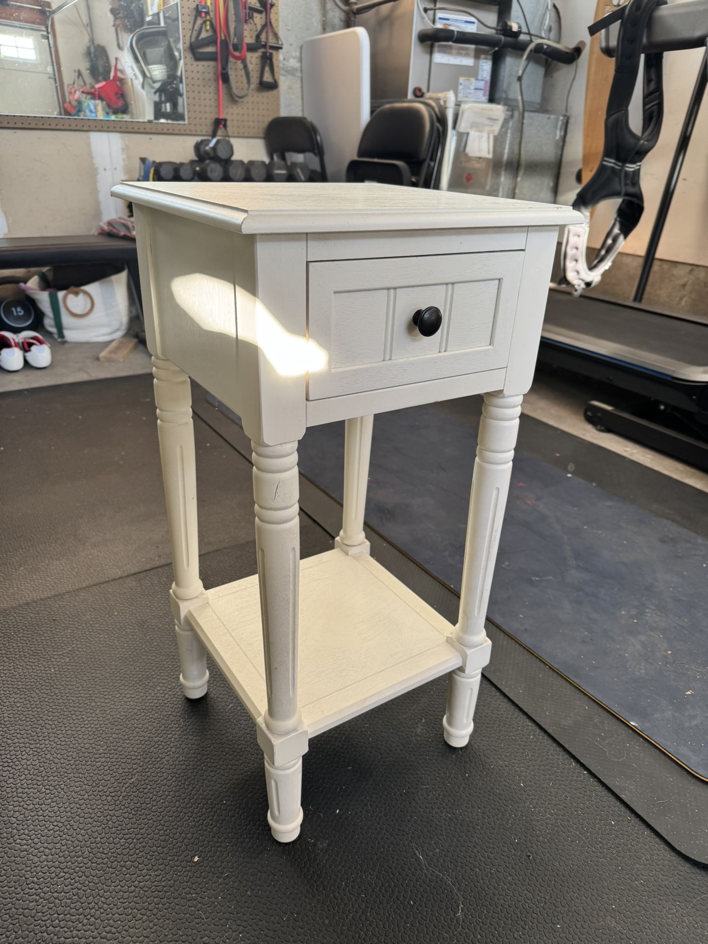 Good condition, solid construction. Single drawer. 28.5” tall, 14.5x14.5 wide