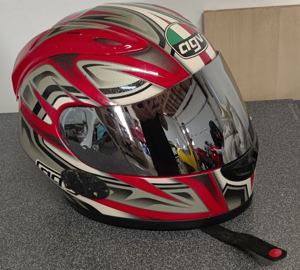 Red and silver AGV XR2 motorcycle helmet. Size large. Well used and old but never dropped.