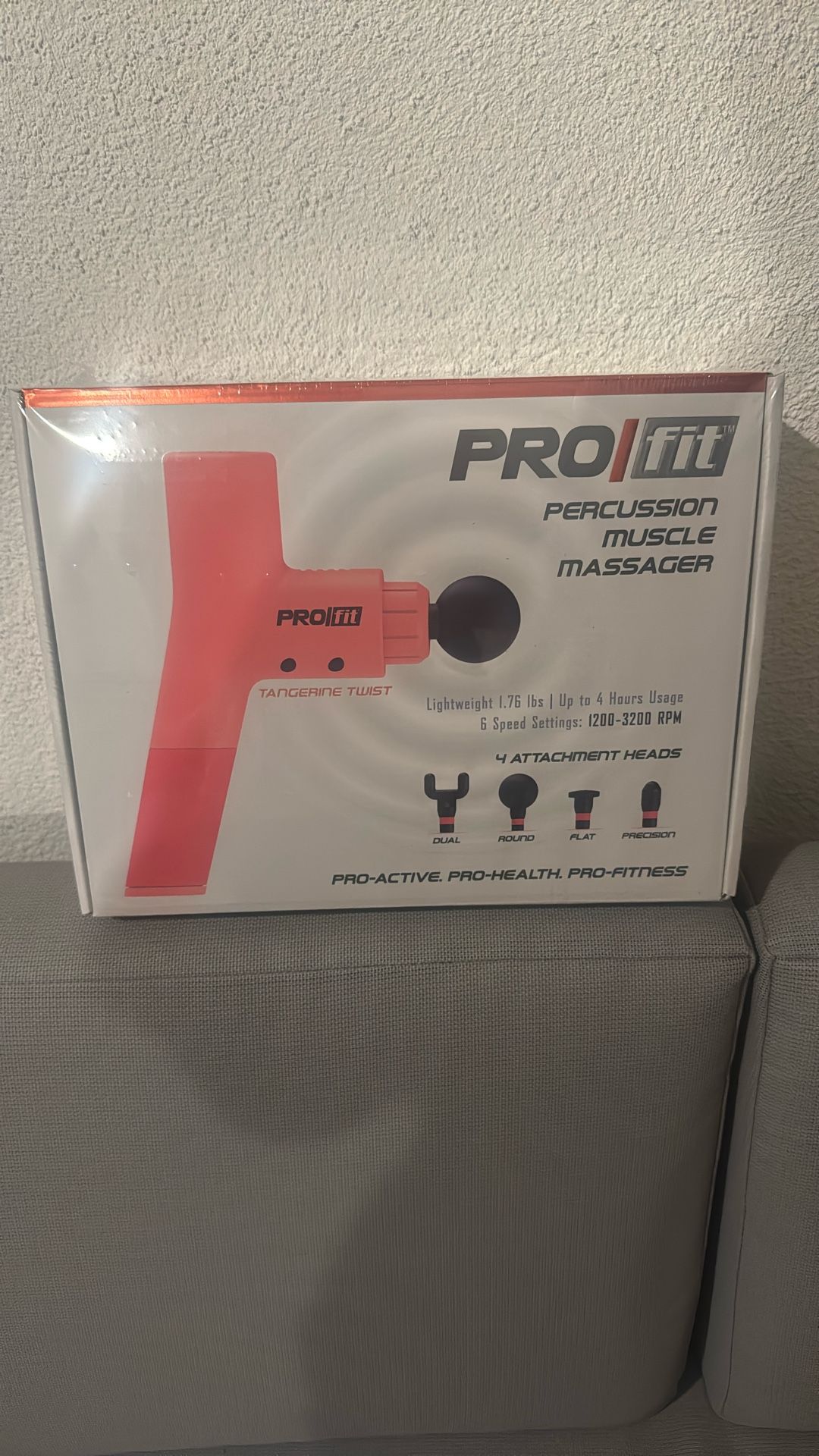 Pro-fit percussion muscle massager Up to 4 hours usage 6 speed settings 1200-3200 rpm 4 attachment heads