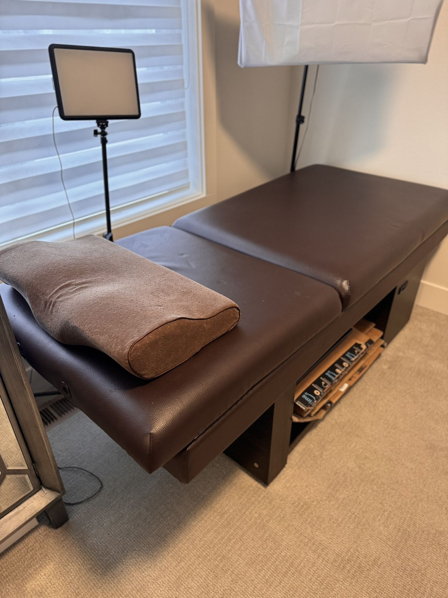 The color is a rich chocolate brown It’s a professional massage bed/ lash chair This is genuine leather and wood It’s very sturdy, beautiful and very comfortable Comes with removable and adjustable headrest