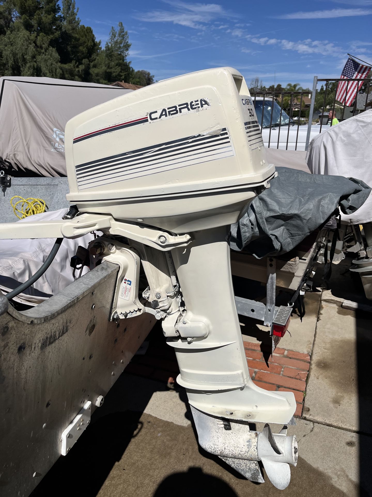 Cabrea/Suzuki pull start, long shaft, 30 hp, 2 stroke tiller outboard motor for sale. Runs fine with lots of compression. Cabrea is the generic brand of Suzuki motors, I believe this one is a 1990. Comes with the fuel tank too. $400