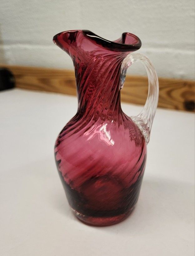Pilgrim Glass miniature glass pitcher. Cranberry Collection 4-1/2" tall swirl glass piece. Excellent condition.