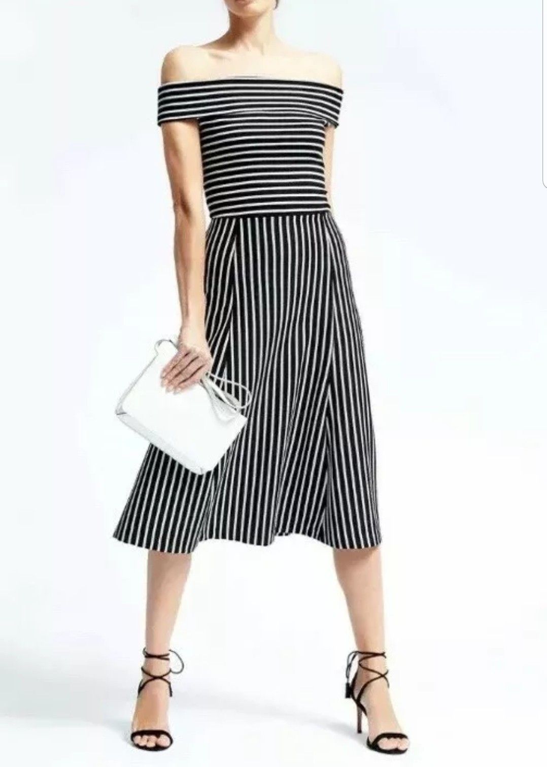 Classy, black and white striped off-the-shoulder dress by Banana Republic women’s size 6. Midi in length. Semi-stretch material. Bodice is lined. Zipper closure on side. A-line cut. Excellent condition. Retail $128. Fk