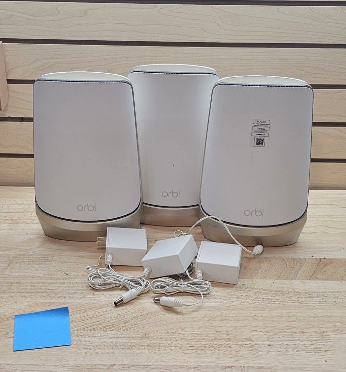 Selling a Netgear Orbi 960 Series WiFi 6E mesh system. This setup includes: 1× Orbi RBRE960 (Router) 2× Orbi RBSE960 (Satellites) All units are used, fully functional, and in good working condition. This is a high-end mesh system capable of extremely fast speeds, strong signal, and excellent whole-home coverage—great for large homes, streaming, gaming, and work-from-home setups. Details: WiFi 6E (tri-band + 6GHz) Very strong range and performance Ideal for gigabit and multi-gig internet Reset and ready for new setup What’s included: Router + 2 satellites Power adapters