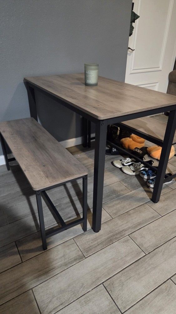 Small dining table with two bench seats that push in to hide under table if wanted. Perfect for small apartment! space saver! Barely used! Little to no wear at all.