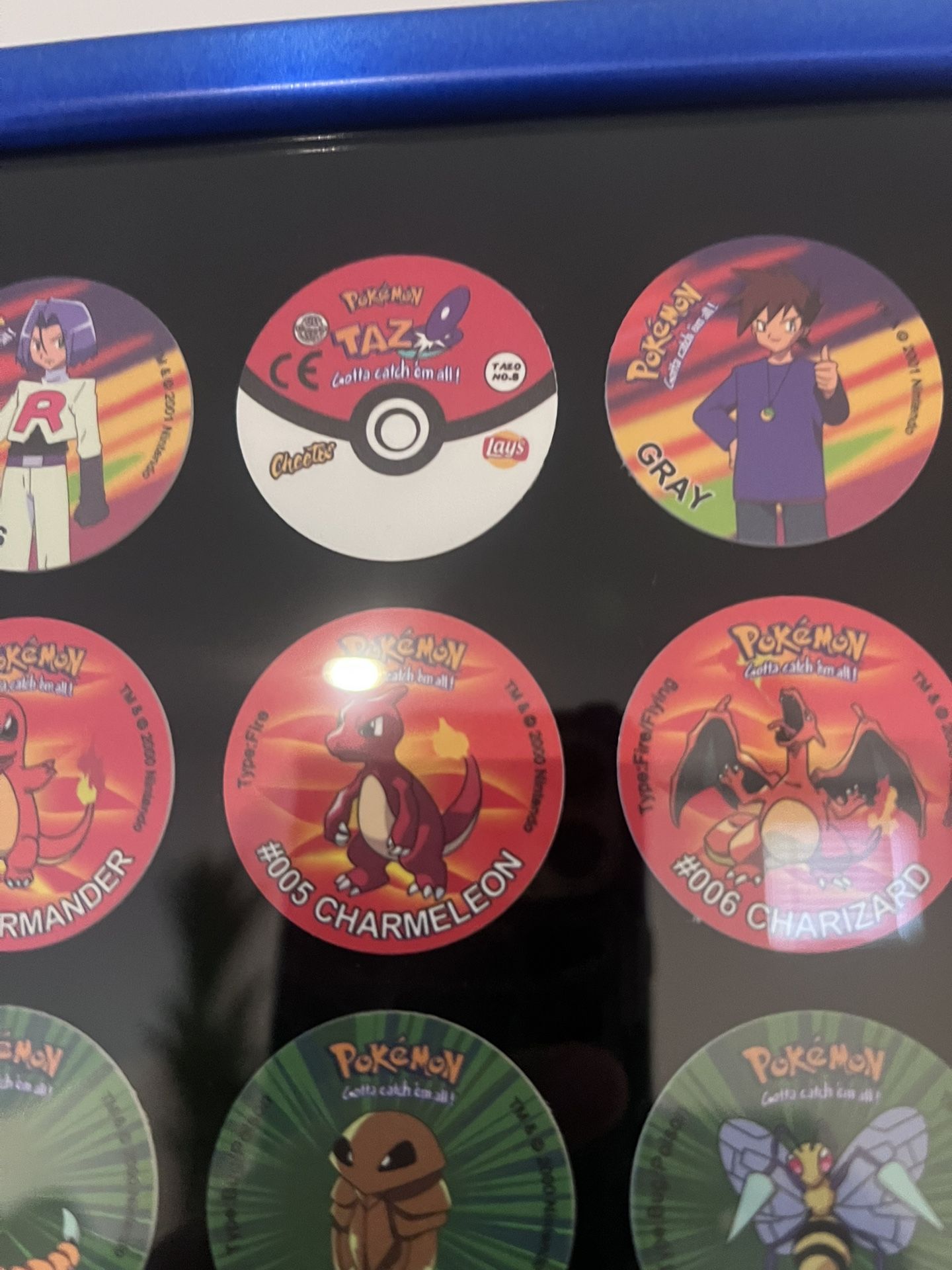 Generation 1 Pokémon Tazos complete collection in a custom frame all pogs are in mint condition.