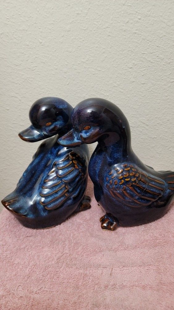 Gorgeous Vintage Ducks Figurines Blue Speckled with Brown contrast woodland Bird pottery