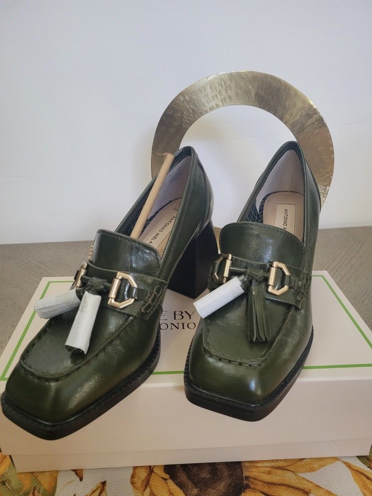 Antonio Melani. Moccasins in Green Leather. Size 7. New with the box. Very Good Dill.