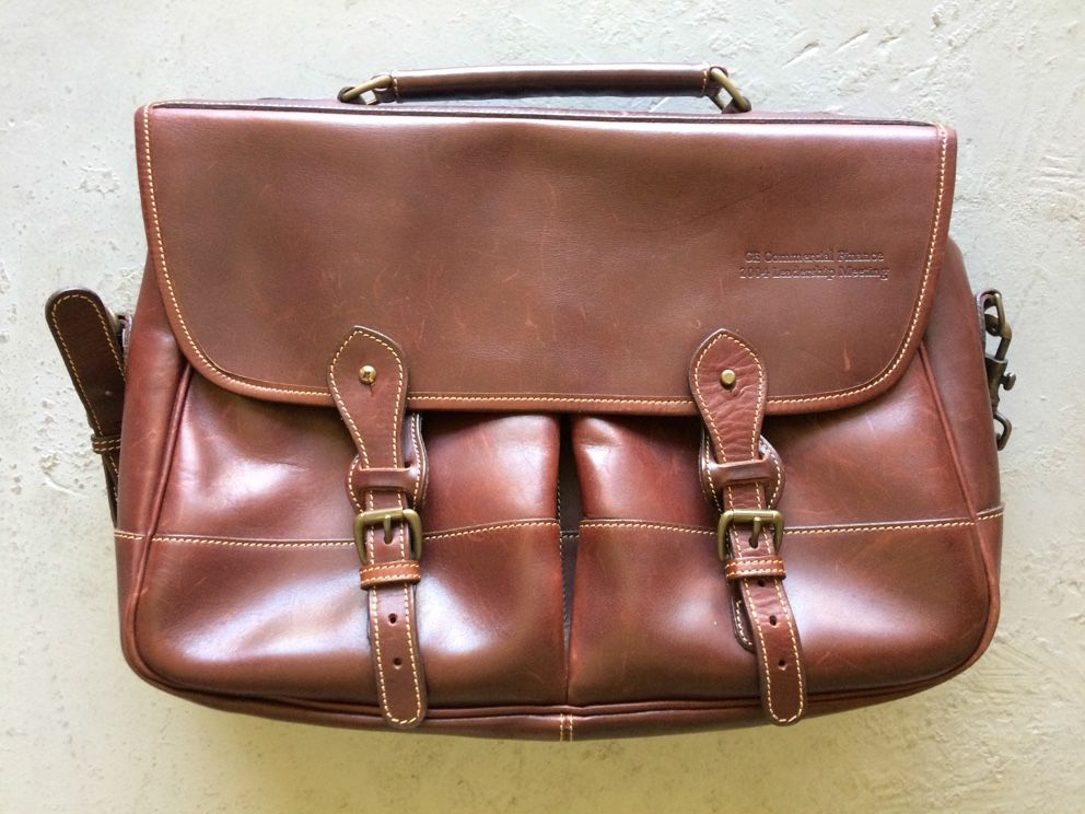 TUSTING Clipper leather briefcase Made in England This is a brown (Sundance) Tusting Clipper leather briefcase in excellent condition. 19 x12 x 5 inches Large main compartment 2 half width front pockets Fully lined Quick release collar stud closures Detachable shoulder strap Brass fittings. Pre-owned. An original rivet was changed by a bronce screw, it can be seen in the pictures. The original rivet is inside one of the briefcase’s front pockets. Embossed on the flap: “GE COMMERCIAL FINANCE 2004 LEADERSHIP MEETING”.