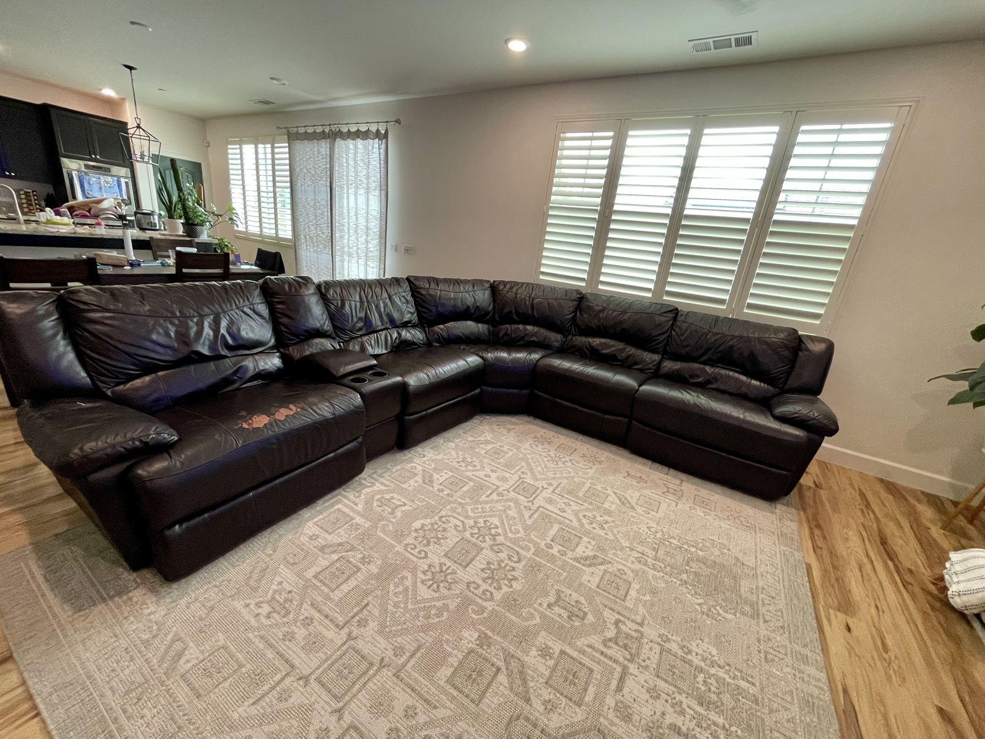 Six piece sectional with three motorized reclining chairs. All of the recliners are functional and have quiet motors. One chair has significant peeling (please see photo) and another has minimal peeling (see photo). This couch is very easy to clean. Please contact me with any questions. Open to offers.