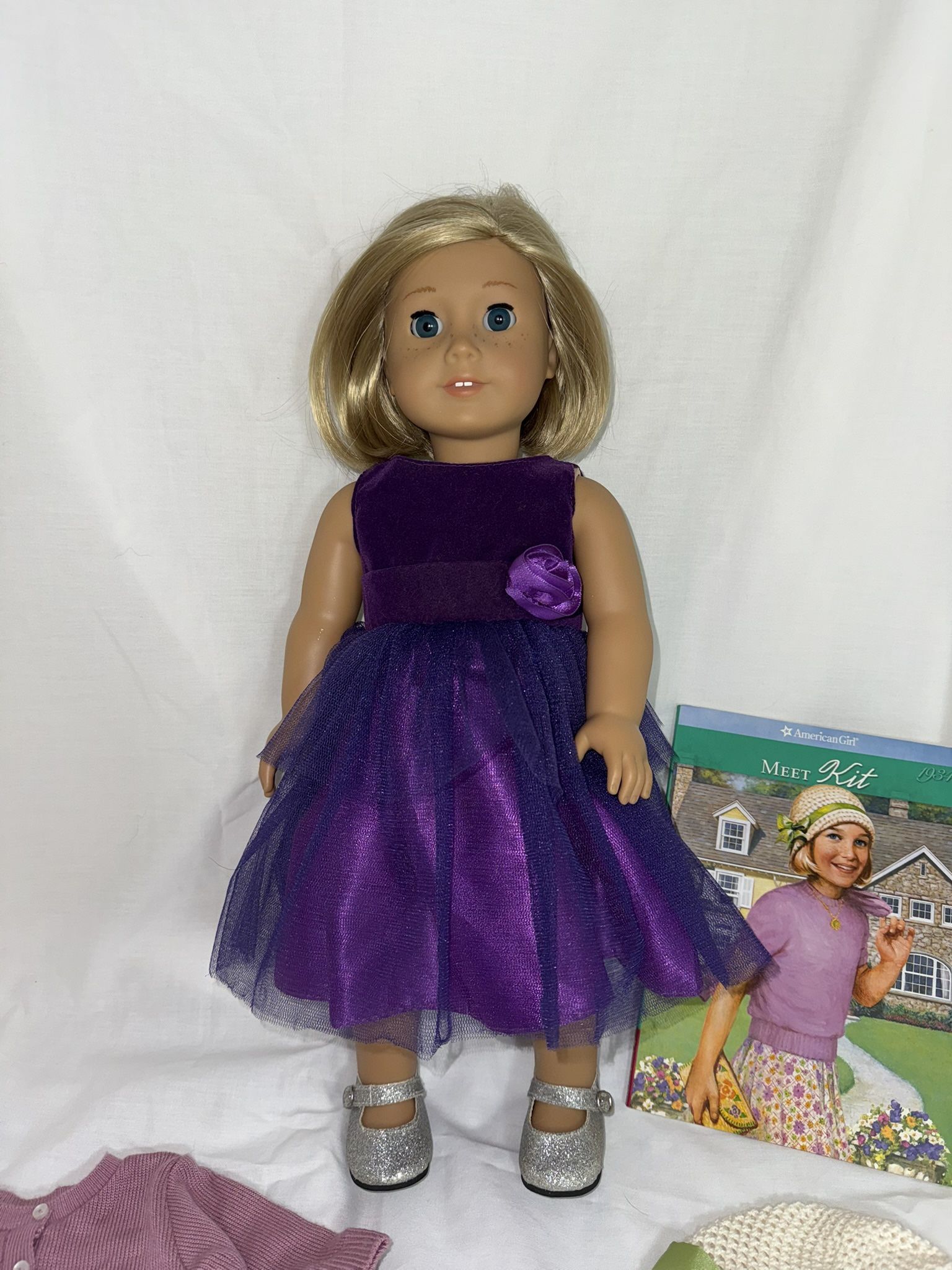 Authentic American Girl Kit Kittredge doll in excellent condition. Includes: Kit Kittredge 18” doll, original Meet Kit book, purple party dress, pink cardigan, white knit sweater, white bloomers/shorts, hat, graphic tee, shoes. Comes from a smoke-free home. Hair, face, and limbs in great shape. Stored carefully and gently played with.