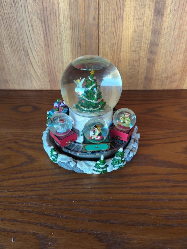 This is a music box. It plays songs and works. It is old. Some of the snow globe liquids have dissipated and it doesn't sit great on the base but with some crafty TLC I'm sure it would clean up and work perfect again. You can wind it and it does play the music
