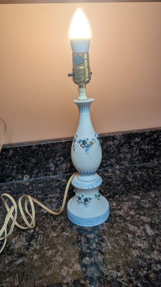 This beautiful one-of-a-kind lamp. Is a classic antique lamp with blue decorative flowers and powder blue accents at the base and in the middle . Just need the perfect lamp shade for it