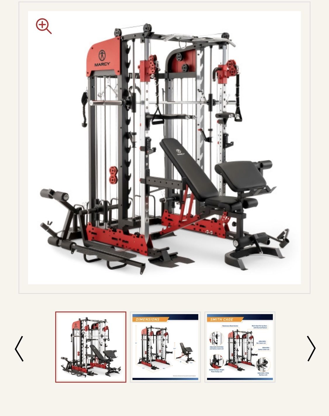 Marcy home gym This sturdy Smith Home Gym has an incredible amount of features suited for beginners and advanced users alike. The SM-7553 is an all-in-one smith cage because it offers a ton of features also have bumper plates from 45 down to 10 pounds weights 500 pounds total.