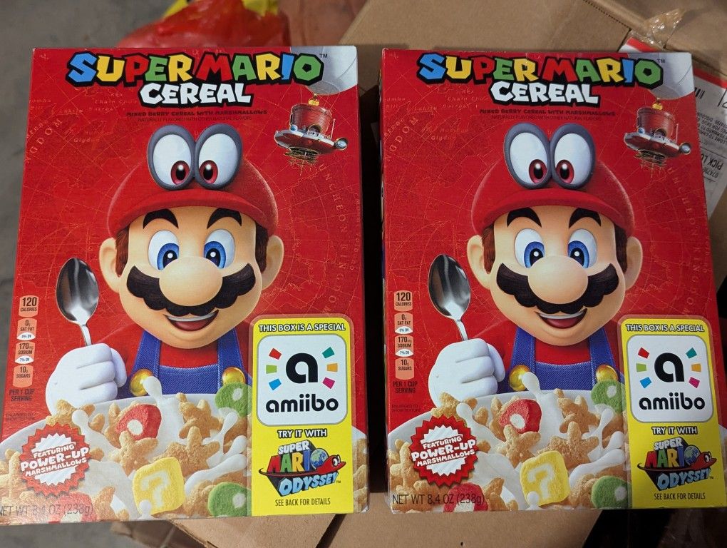 Super Mario Cereal from 2017 - Collectible from Release of Mario Odyssey (2 boxes) Brand new, unopened, unused, set aside for my video game collection. Rare cereal, Both boxes have a cutout amiibo on the cardboard box that you can use in game for exclusive rewards. This is just for the 2 boxes of cereal. No games or consoles included. I can meet most days in Oak Grove or Grain Valley.