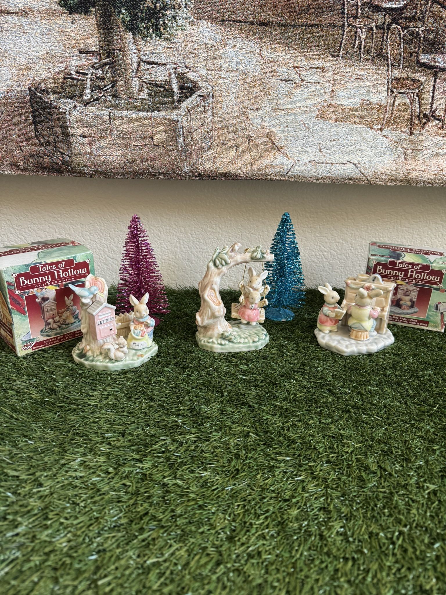 Rare Vintage (1993) Albert Price “Tales of Bunny Hollow” Hand Painted & sculpted glazed Porcelain Bunnies figurines - all in excellent condition. ** $17.00 EACH item** (#1) Vintage Tales of Bunny Hollow porcelain Bunny Mail Delivery 4” X 3.5” with original box (#2) Vintage Tales of Bunny Hollow Porcelain Bunnies at the Piano playing music together 4" X 3.5" - With original box (#3) Vintage Tales of Bunny Hollow porcelain Bunnies on a swing 5” tall X 3.5 wide do not have original box Trees displayed Not for sale