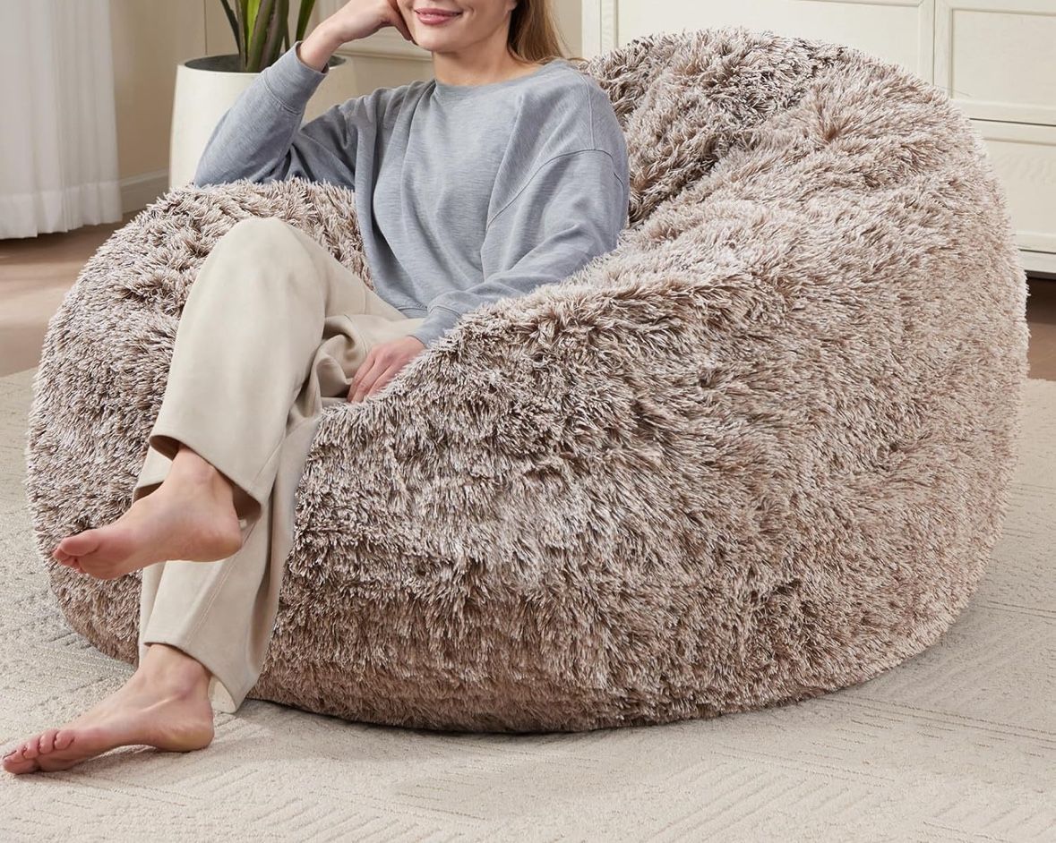 Cozy faux fur bean chair, cover, with a mesh underside. Perfect for adding warmth and style.