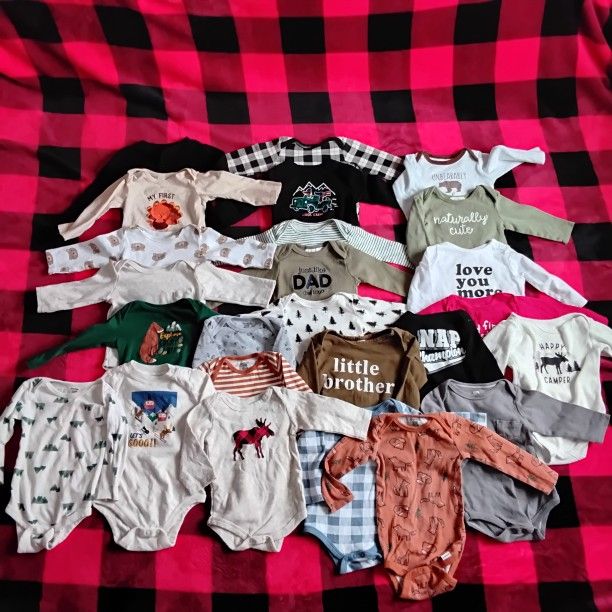 6-9 X1 fleece outwear onsie ×6 sweaters X1 button up top X22 pants X11 onsie tops short sleeve X25 onsie long sleeve tops X15 pj's 6m X3 sweaters X13 onsie tops X5 pants X9 onsie pj's 6-12m X2 pants X3 onsie tops X1 halo sleep sack X6 sleep sacks