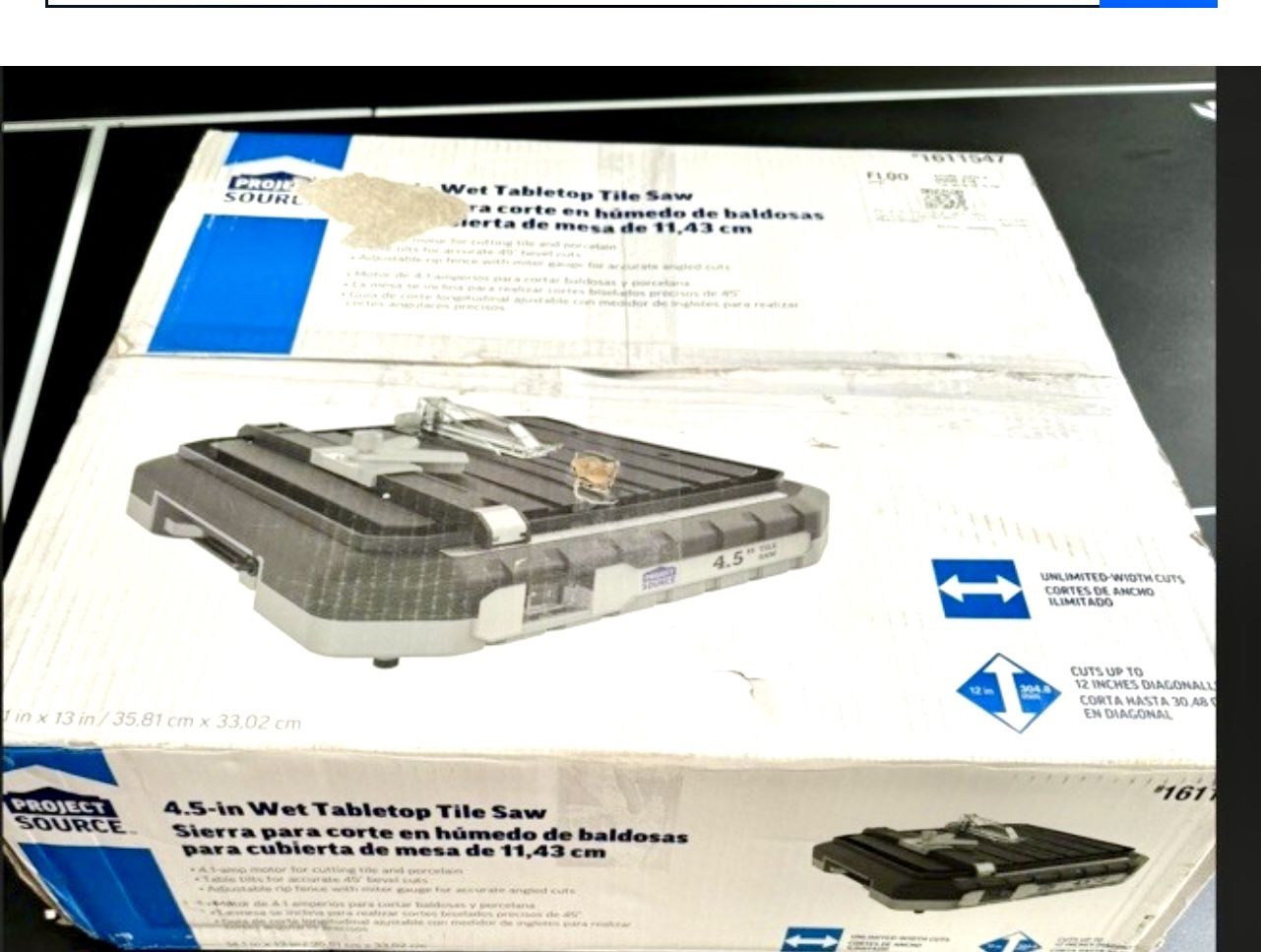 Actually never used the saw it just looks used because the box is a little worse for the wear This 4-1/2" portable and compact tile saw is powerful enough to cut through tile and porcelain to make quick and accurate cuts. • 4.1-Amp motor generates 5300 RPM for precise and quick cuts through tile and porcelain • Table tilts for accurate 45° bevel cuts • Adjustable rip fence with miter gauge for accurate angled cuts • Compact design for easy transport