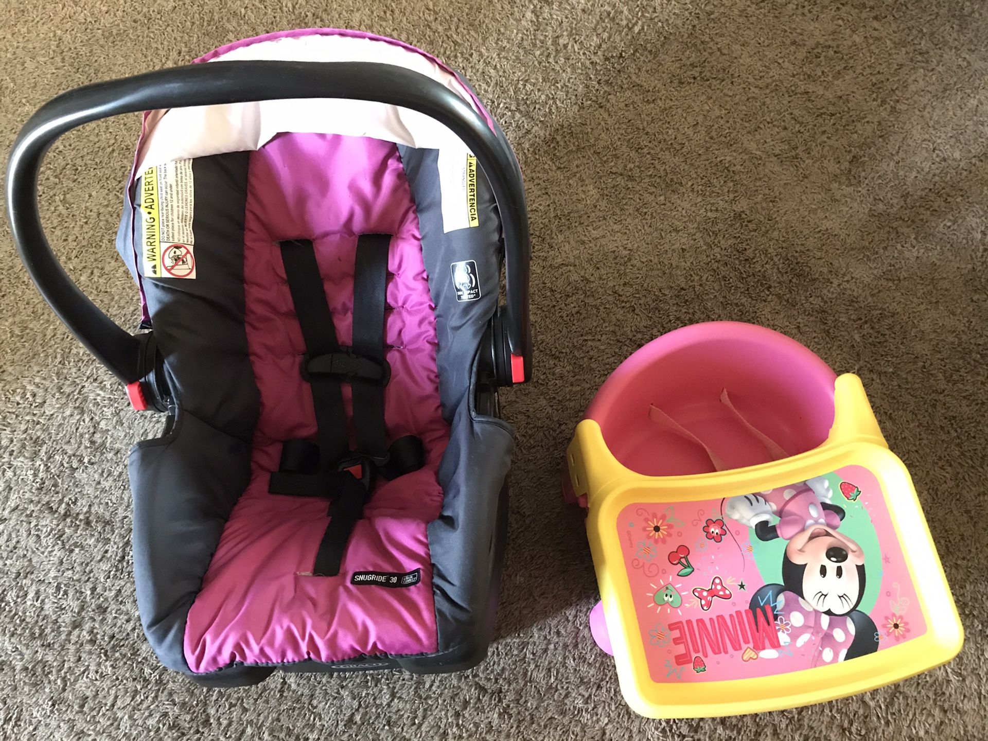 Snug ride baby car seat with a base for a 4 to 35 pounds baby Minnie Mouse baby girl booster chair Both in a very good condition