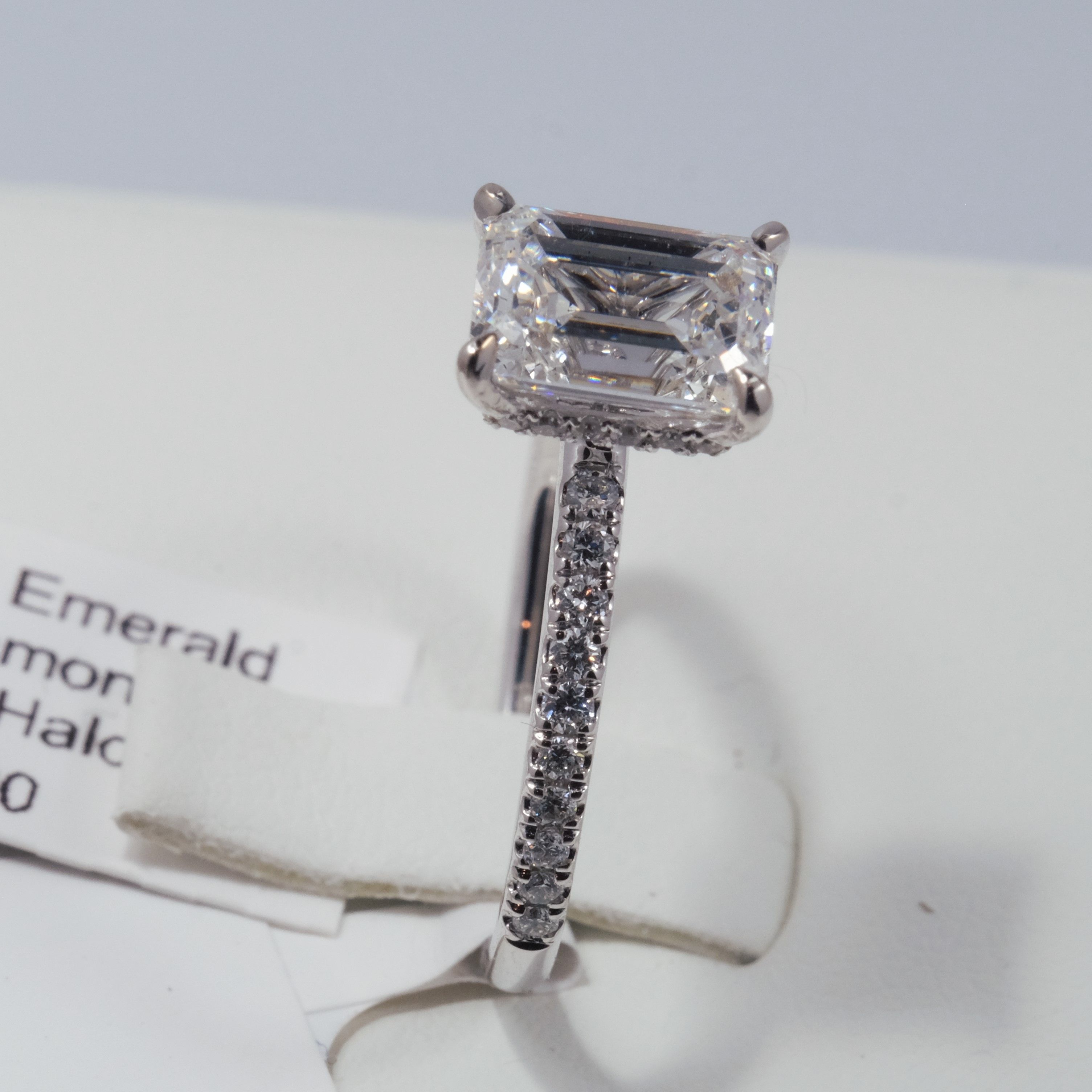Come see this Diamond Ring in our showroom at Lords of Luxury in Bellevue and ask for me, Ray, to receive this special internet sale price. Total Carat Weight: 2.32ct (2.01ct center diamond + 0.31ct pave setting) Diamond Type: Lab-grown Diamond Shape: Emerald Cut Diamond Color: E Diamond Clarity: VS2 Setting: Hidden halo with pave detailing Certification: IGI - LG6351186635 Size 7: free resizing at our store This elegant ring features a stunning 2.01-carat emerald cut diamond as its centerpiece, accented by a hidden halo and pave setting that adds an additional 0.31 carats of sparkling diamonds. The center diamond, with an E color grade and VS2 clarity, is beautifully showcased in this sophisticated design, offering timeless beauty and luxury.