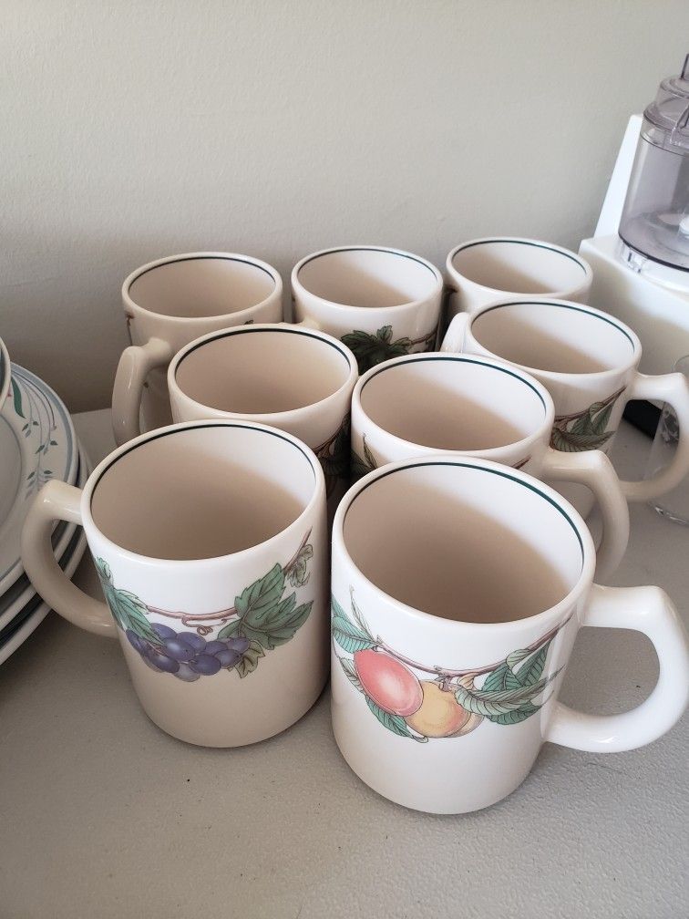 Set of 8 ceramic fruit design mugs by Epoch All are in excellent condition with no chips or cracks.