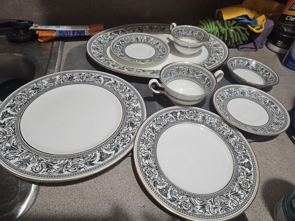 Bone China made in England. Florentine style W4312, Black dragons. Absolutely gorgeous bone China service! Unique Dragon pattern. Near perfect condition. Set includes: 12 dinner plates 12 salad plates 12 bowls 10 two-handled soup cups 12 saucers 1 large serving plate 1 teacup and saucer set 1 vegetable tureen $1800 or Best offer for all 62 pieces.