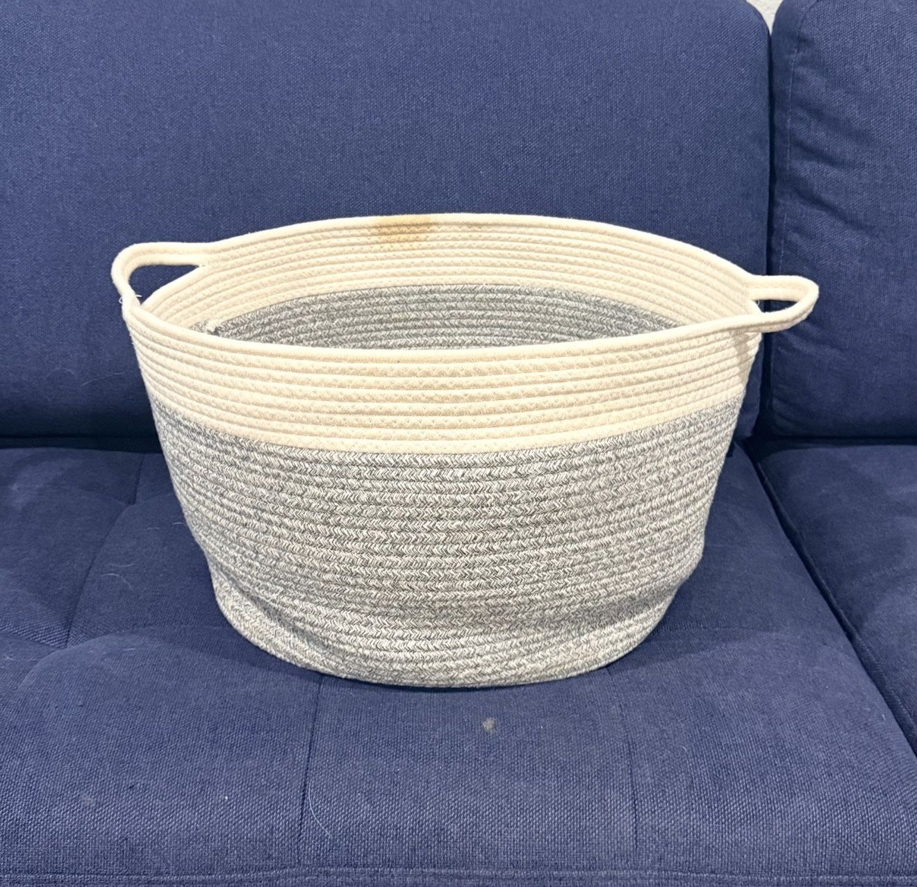 ~ Large woven rope storage basket in a neutral gray and cream color scheme with integrated side handles. ~ Approx. measurements: • ~15” diameter at base • ~20” across at top (flexible, wider near handles) ~ Sturdy and flexible ~ great for: • blankets or throws • toys • laundry • pillows or stuffed animals • nursery or living room storage ~ Basket is in great overall condition. NOTE: There is one small stain on the lighter rim area (I have not tried to remove). Priced accordingly. Please see all photos for details ~ Check out the rest of my available listings and contact me for more info 📍Pick up in Palm Desert