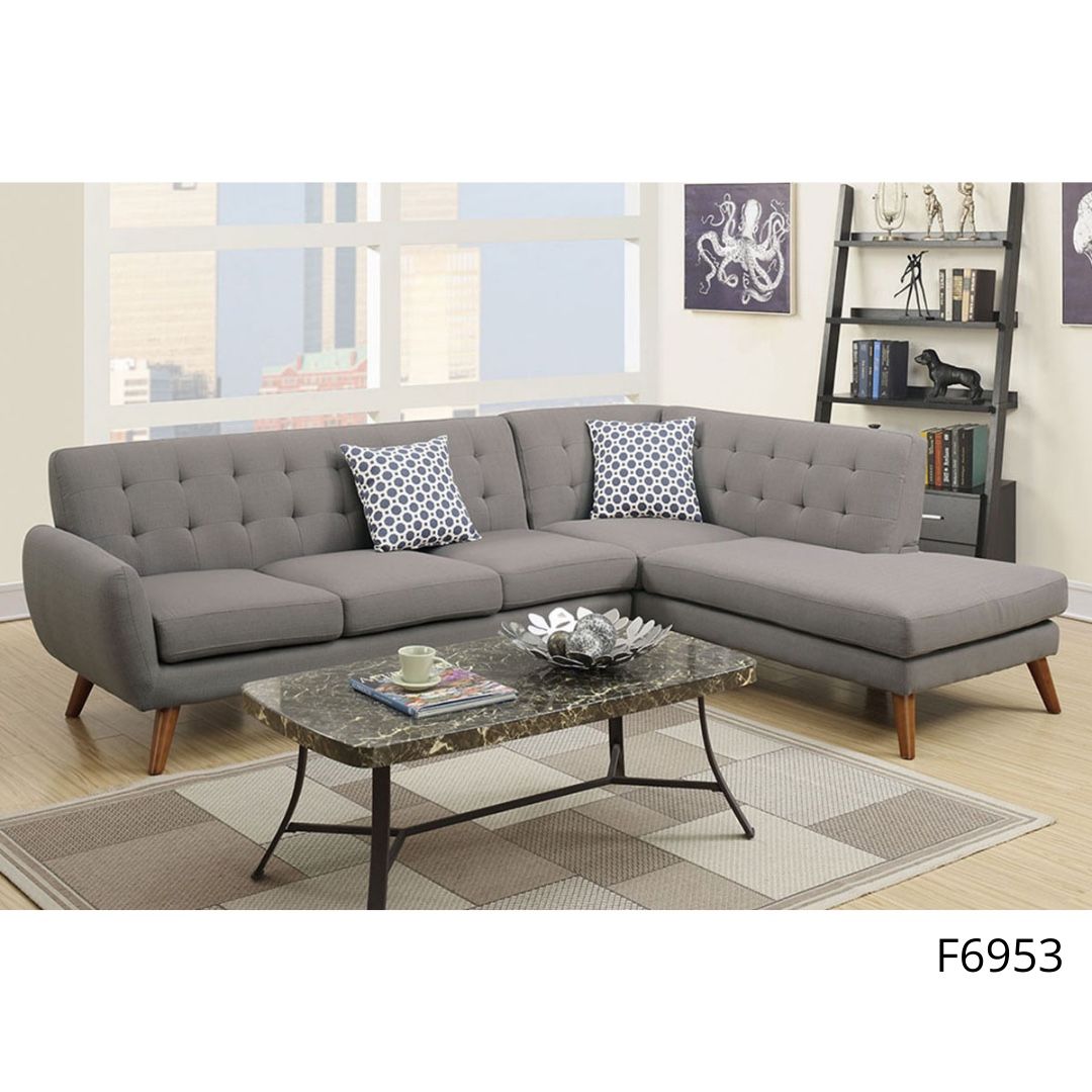 An uptown state of mind, this 2-piece sectional is for the hipster with a unique sense of style. Tightly upholstered with accent tufting on the back supports, this sectional also features a chaise and accent pillows. Sectional Sofa Item # F6953 Color: Grey Available in Grey, Ash black & Laguna Some Assembly Required Materials: Polyfiber Pine Wood Wooden leg Dimensions: Sectional: 111″ x 80″ Chaise: 80″ x 35″ x 33″ Sofa: 76″ x 35″ x 33″H *Chaise is Not Reversible