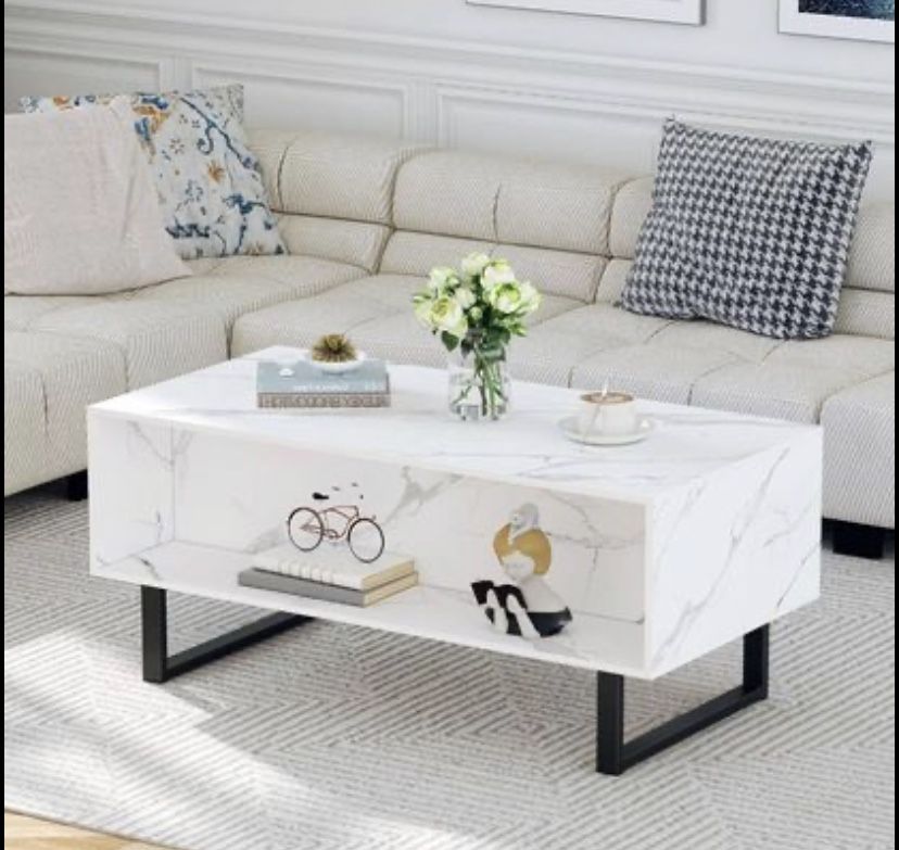 Brand New Still in box Coffee Table with LED Lights Two Drawers for Storage Hidden Storage Open Shelves Size: 21.7"D x 41.7"W x 19.7"H Natural White / Grey / Gray Stone Top Design Black Metal Frame Modern Furniture