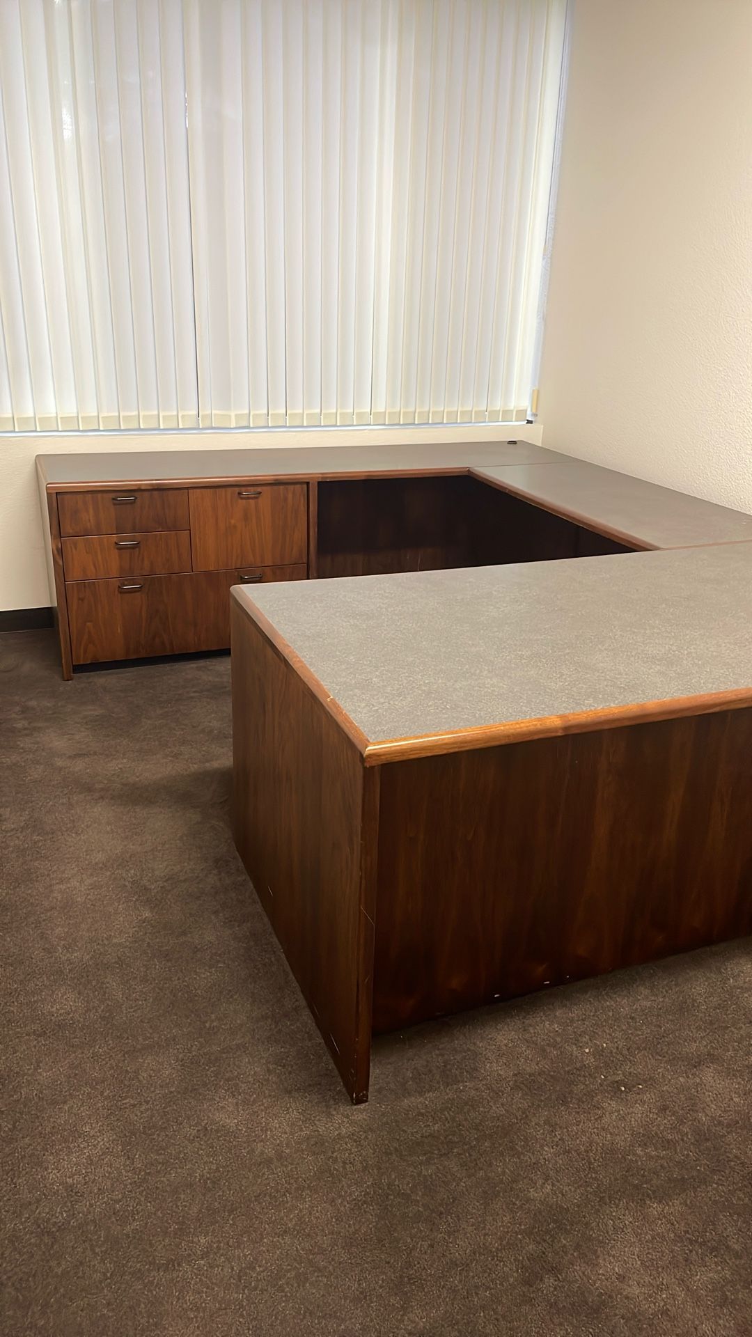 If it’s posted it’s available Good condition Dark wood Main desk: 70”L 28-1/2H 36”D Back desk: 22”D 7’L Side desk: 22”D 48”L See other listings for more office furniture