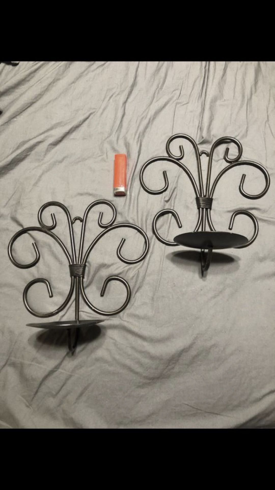 Rod iron candle holders. Selling together and lipstick for size comparison.