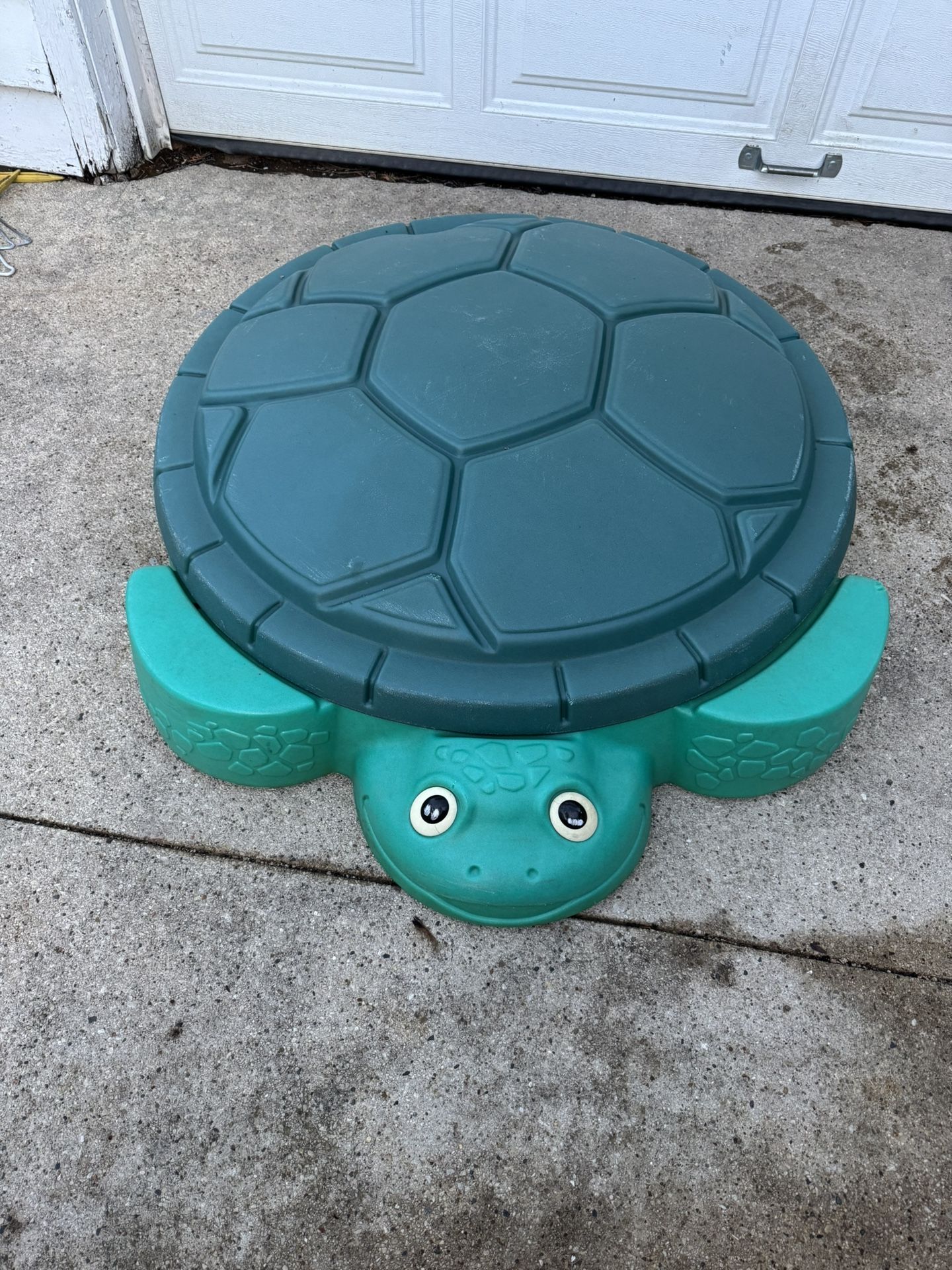 Little tikes turtle sandbox with lid Solid one piece bottom Little Tikes Turtle Sandbox With Cover for Kids outdoor 1 piece molded bottom and top Normal wear Cash only as is