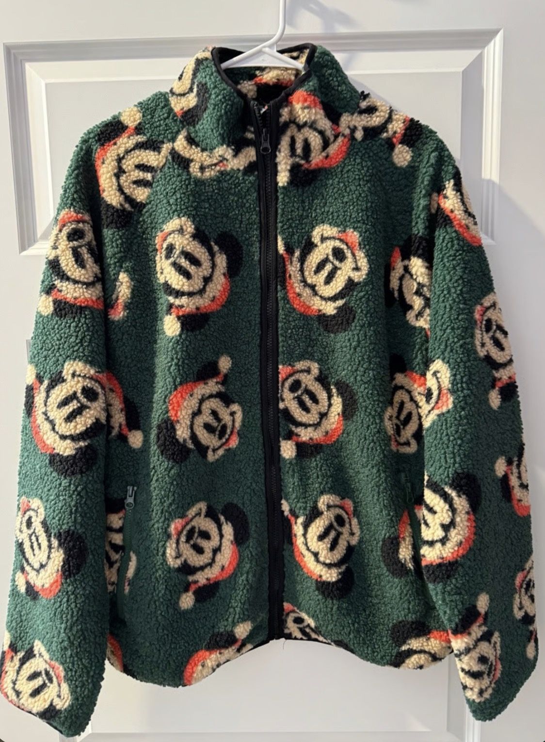 Disney Santa Mickey Mouse Christmas Green Sherpa Zip Up Sweater