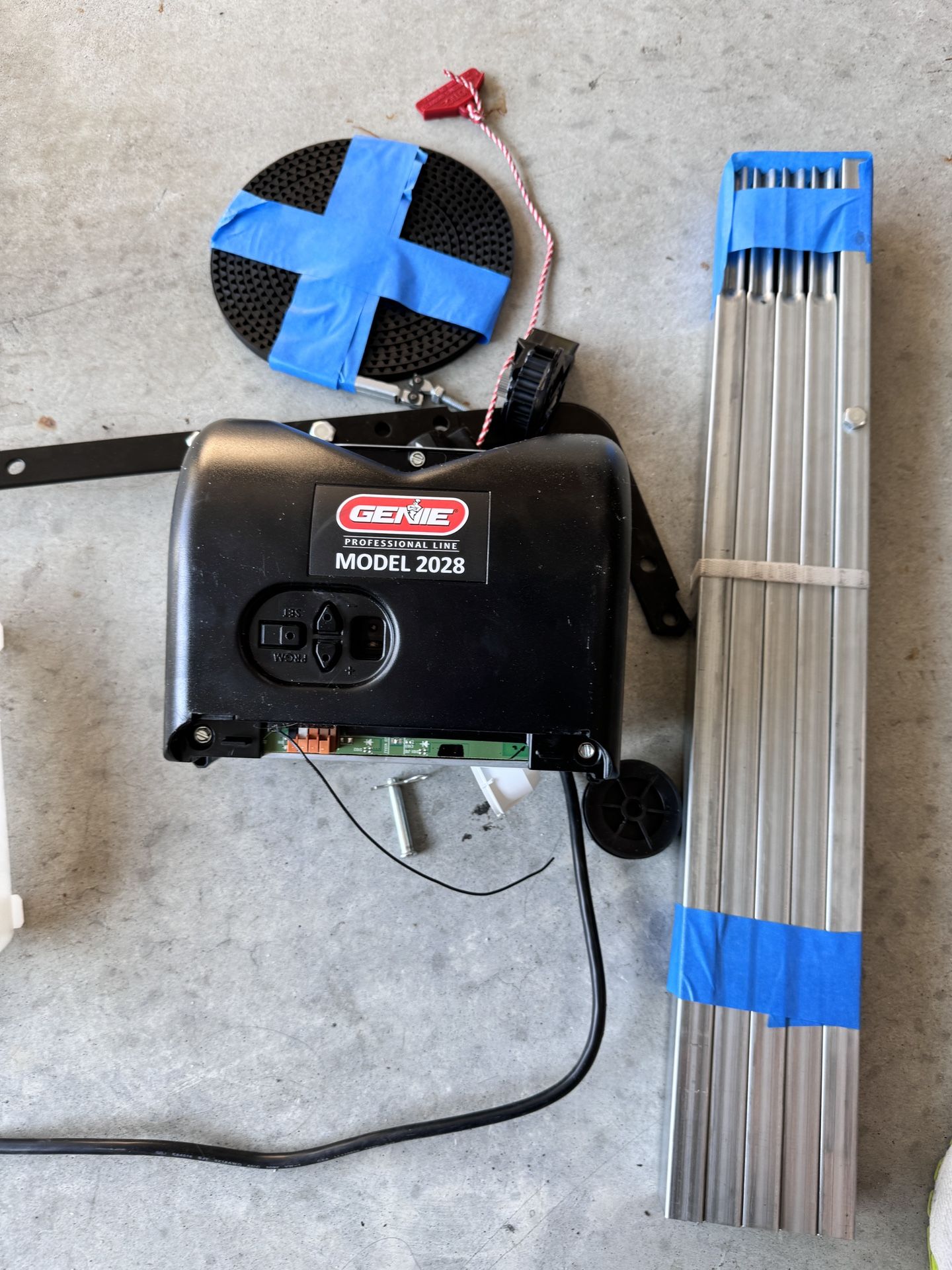 Used Genie garage door motor model 2028. Belt driven. With rails and some hardware