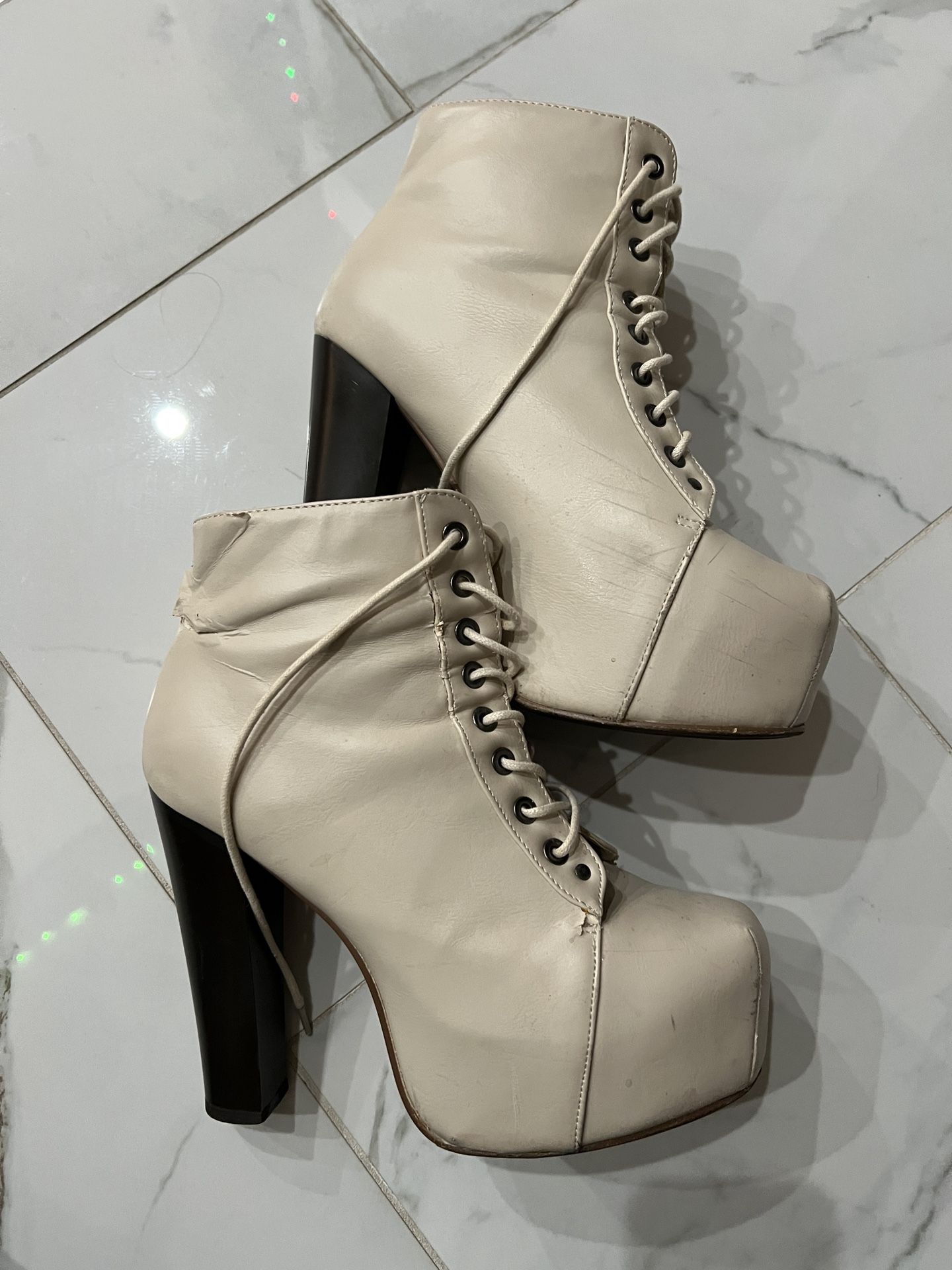 Platform White Lace Up Booties with New Heels and Bottoms Size 9, some shedding on the backside as show . The bottoms are excellent, they were recently re done by a professional cobbler. These are great shoes for a project or make over. There is a platform in the bottom at the front under the ball of the foot to go with the heel height, so they are actually quite comfortable.
