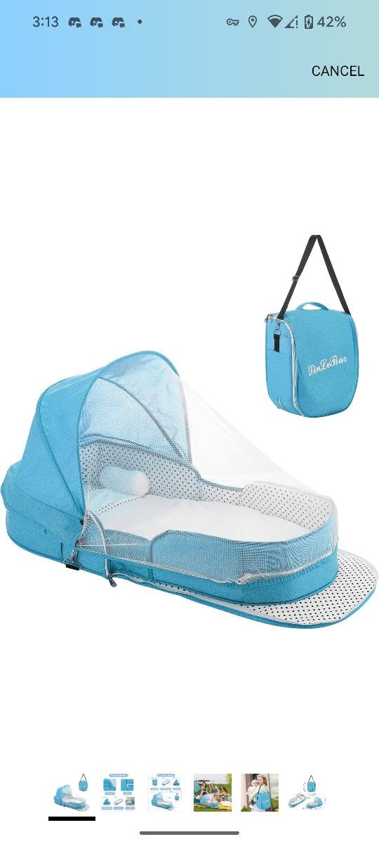Located in Fountain Hills. Cross streets are Boulder and Tepee. Brand new in box (only removed for pictures) foldable travel bassinet in light blue. Can be a crossbody or backpack. The travel crib includes a mattress mosquito net, a small pillow, and a shade. When fully assembled, the travel bassinet measures 36.2 x 14.9 x 17.5in. The available mattress size is 31.4 x 14.1in. The size of the folded backpack is 15.7 x 14.9in. The overall weight of the travel crib is 3.66lb.