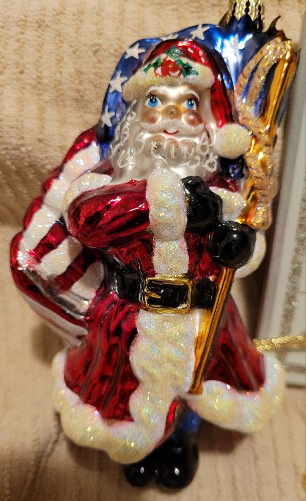 Christmas ornaments. Santa ornament holding American Flag is broken at the top, right. Not too noticeable. All for $6