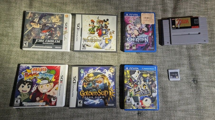 I'm selling a mix of games. Most are Complete in Box (CIB) and in great condition. The Games Loose Cartridges: The Legend of Zelda: A Link to the Past (SNES) - Original authentic cartridge: $40 Shin Megami Tensei IV (Nintendo 3DS): $40 Complete in Box (CIB): Persona 4 Golden (PS Vita): $35 Naruto Powerful Shippuden (Nintendo 3DS): $35 Fire Emblem Awakening (Nintendo 3DS): $35 Golden Sun: Dark Dawn (Nintendo DS): $35 Kingdom Hearts Re:coded (Nintendo DS): $30 Conception II: Children of the Seven Stars (PS Vita): $20