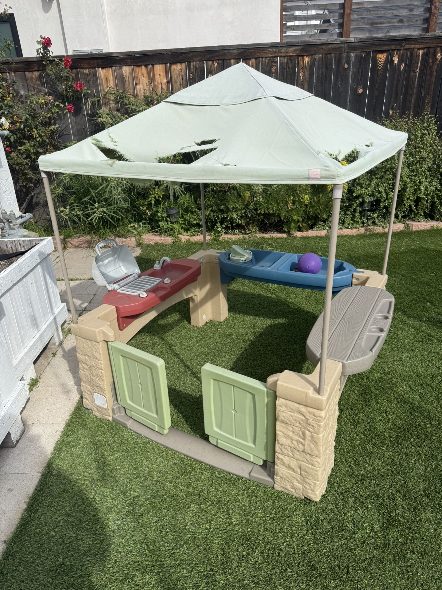Tears in the roof fabric and overall weathered but otherwisr perfectly good for young imaginative chefs