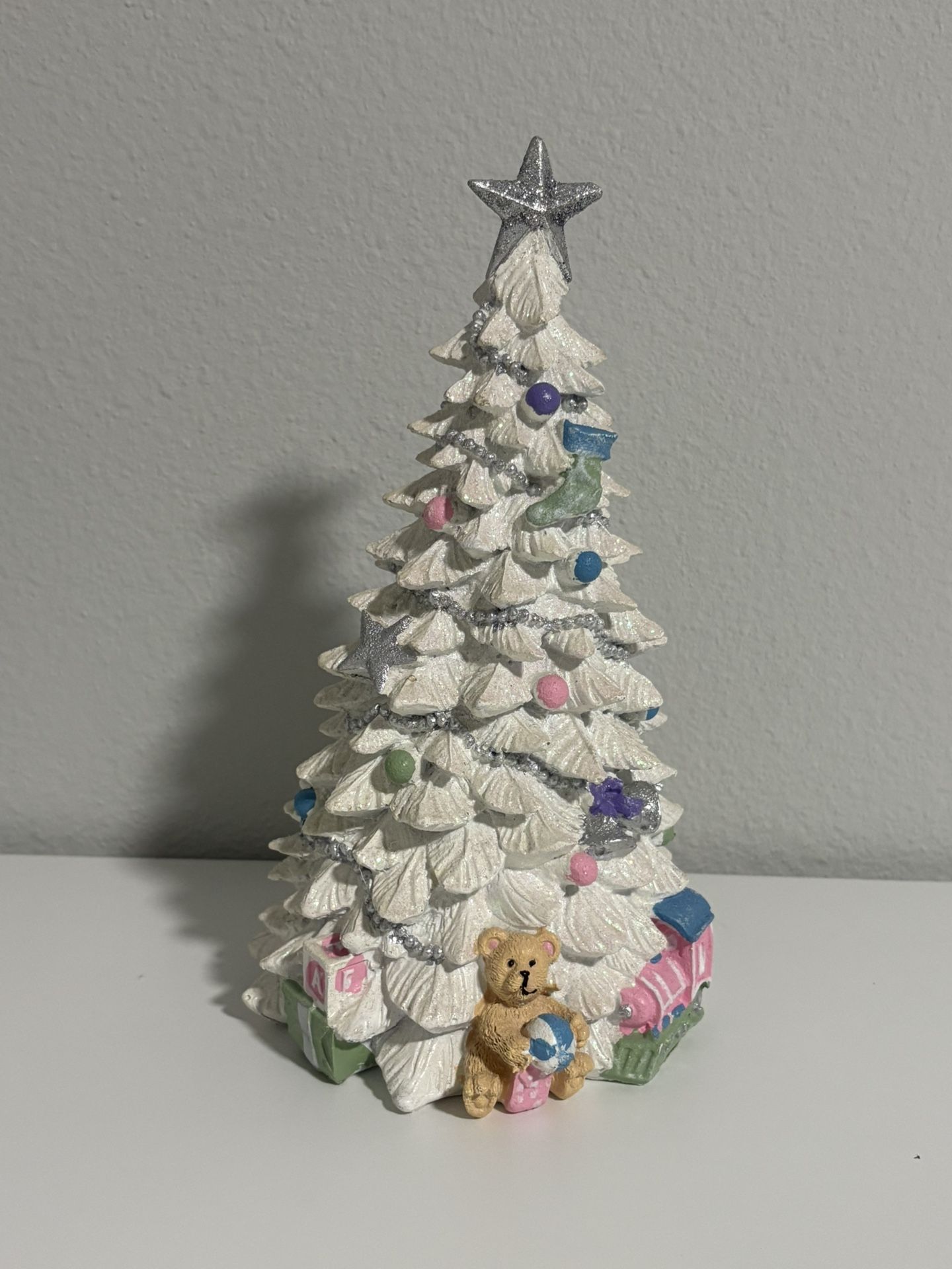 10-Inch Ceramic Christmas Tree Decor Beautiful white Christmas tree with glitter details, ornaments, presents, and a cute teddy bear.