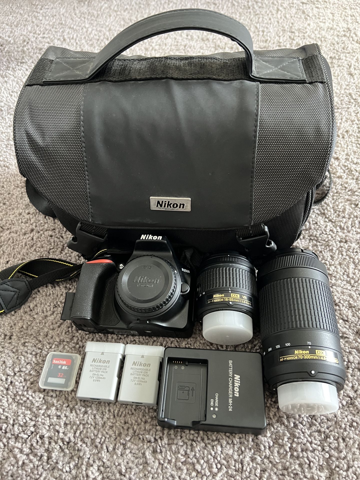 OR BEST OFFER Selling my Nikon D3500 DSLR bundle in like-new condition — only 2,320 shutter clicks (barely used). Perfect all-in-one setup for anyone serious about photography or wanting professional-quality results without the price tag of a new kit. Included in the bundle: • Nikon D3500 DSLR body (24.2MP, 1080p Full HD) • AF-P DX NIKKOR 18-55mm f/3.5-5.6G VR lens • AF-P DX NIKKOR 70-300mm f/4.5-6.3G ED lens • Original Nikon carrying case • 2 Nikon EN-EL14a rechargeable batteries • Nikon MH-24 battery charger • SanDisk 32GB SD memory card Condition: Everything looks and works like new. Lenses are spotless (no scratches or fungus). Always stored in the Nikon case. Details: • Shutter count: 2,320 (verified) • Smoke-free, pet-free home • Ready to shoot immediately Why this setup: Covers everything from portraits to wildlife. Lightweight, fast, and sharp. This is one of the most reliable and beginner-friendly DSLRs Nikon ever made. Tags (optimized): nikon d3500, d3500 camera, nikon camera kit, dslr bundle, nikon lenses, photography camera, 70-300mm, 18-55mm, beginner camera, professional camera, vlogging camera, travel camera, camera bag, low shutter count, like new