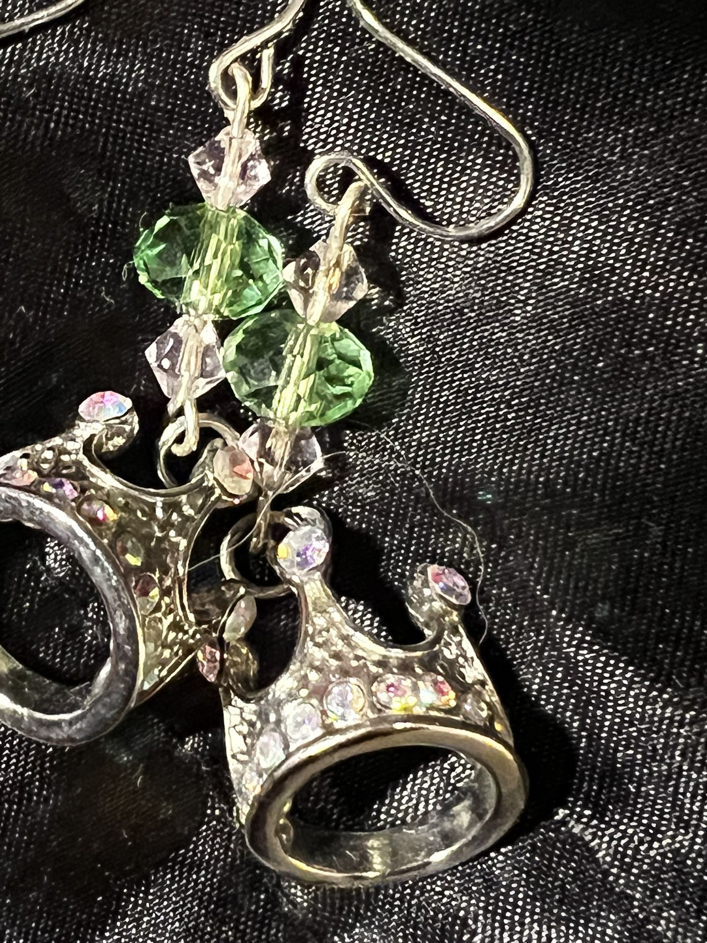 Crown Princess drop earrings with stones Sparkly and super cute! The crown has iridescent rhinestones and in the drop is pink and green stone. Never worn! $8.00